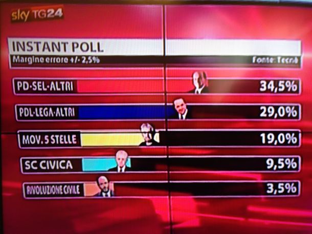 FIRENZE – Secondo il primo instant poll dell’Istituto Tecnè per Sky la coalizione di centrosinistra (Pd-Sel-altri) è al 34,5% e vince le elezioni, il centrodestra (Pdl-Lega e altri) al 29,0%. Il Movimento 5 Stelle è invece al 19% mentre le liste Monti al 9,5% e Rivoluzione Civile al 3,5%. In base ai questi primi dati il centrosinistra alla Camera si aggiudicherebbe 340 seggi mentre il Pdl-Lega 140. Seguono il Movimento 5 Stelle con 91 seggi e le liste Monti con 46.