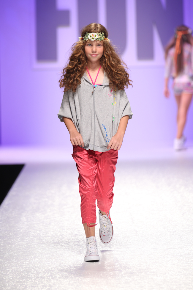 Fun&Fun presenta una collezione che mescola in modo “casual” gli stili più amati dalle bambine e dalle ragazzine creando un mood che si rifà allo sport, alla musica e alla danza. Un’immagine contemporanea che mescola con gusto lo stile romantico e quello urbano abbinando volumi over e silhouette aderenti, con colori che spaziano dai delicati toni cipria o grigi agli effervescenti fuxia e verde lime, mentre l’azzurro zaffiro è mescolato a gamme decise di giallo o di verde. I toni più accesi del corallo e dell’aragosta donano sfumature esotiche; dal più classico bianco e nero emerge il giallo più luminoso. Un’attenzione particolare è riservata ai motivi floreali e ai tessuti come le mussole di seta, i plissé o le reti colorate pensati per i pantaloni, gli shorts, le t-shirt e gli abitini più attuali.