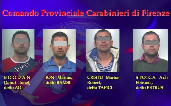 Quattro degli undici malviventi sono rientrati nel loro paese e per essi è stata richiesta l’internazionalizzazione dell’ordinanza di custodia cautelare. L’operazione è stata condotta dai Carabinieri della Compagnia di Figline Valdarno, diretti dal capitano Luca Mercadante, con l’intervento del Nucleo Operativo Radiomobile di Figline, agli ordini del luogotenente Santino Sechis e del maresciallo capo Nello Fasciolo. A supporto per l’operazione di stamani, oltre all’elicottero «Fiamma» AB 412 del 4° Nucleo di Pisa, sono intervenuti militari delle compagnie di Firenze, Firenze Oltrarno, Scandicci.