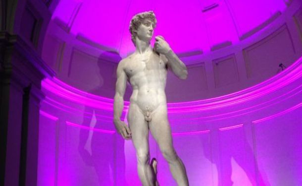 FIRENZE – È universalmente riconosciuto come il simbolo della città di Firenze, il David di Michelangelo. Ieri, 8 marzo, si è tinto di rosa in una serata benefica per la sensibilizzazione contro la violenza sulle donne. David protagonista involontario anche della campagna pubblicitaria di una fabbrica d’armi statunitense. Dall’Illinois arriva l’immagine del giovane michelangiolesco che imbraccia un fucile, al posto della tradizionale fionda.