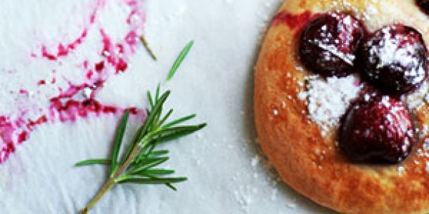 Make shallow indentations all over dough with your fingertips, then brush with rosemary oil, letting it pool in indentations. Gently push cherries into the indentations. Sprinkle sea salt evenly over focaccia and bake in middle of oven for 20/25 minutes.