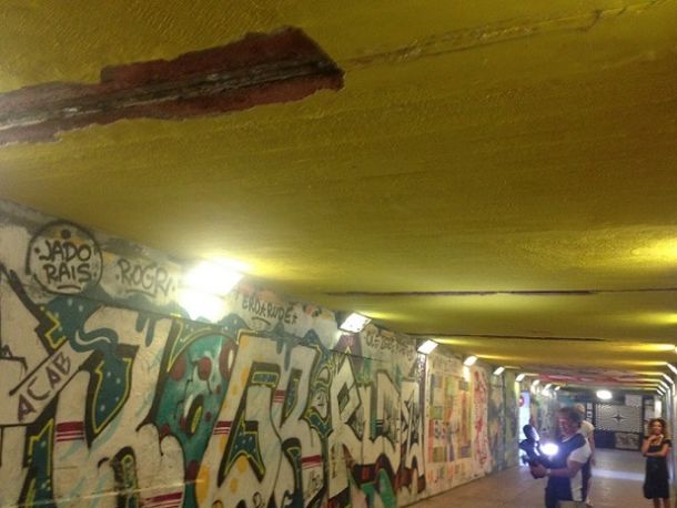 FIRENZE – Alcuni passanti hanno segnalato stamani ai vigili del fuoco e alla polizia municipale che cadevano calcinacci dal soffitto nel sottopasso delle Cure.  Dopo aver circoscritto col nastro l’area interessata dai crolli, i pompieri l’hanno messa in sicurezza scrostando il soffitto dal quale pendevano pezzi di intonaco residui. Altri erano già caduti a terra, ma non avevano provocato danni nè ai pedoni nè ai ciclisti che numerosi attraversano, in sella al loro mezzo, il sottopasso. Il crollo è avvenuto in corrispondenza dei binari della ferrovia.  Secondo i primi accertamenti tecnici, sul soffitto del corridoio centrale graverebbero pesanti infiltrazioni di pioggia che hanno aperto tre “ferite” lunghe tre metri circa e larghe poco meno di mezzo. Il  sottopasso è rimasto aperto  e sono stati tolti i calcinacci e i nastri che circoscrivevano l’area interessata.