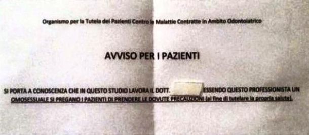 Nel delirante volantino viene riportato il nome del professionista in questione e si legge che «essendo omosessuale» i pazienti sono pregati di «prendere le dovute precauzioni, al fine di tutelare la propria salute».