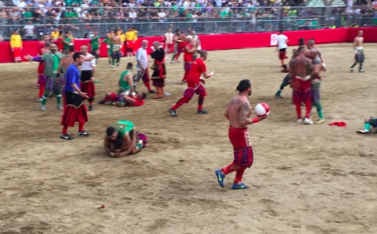 FIRENZE – La mia reazione, dopo i primi 15 minuti dei 50 regolamentari, è stata d’irritazione: per via dei violenti testa a testa a metà campo, come isolati match di pugilato calati nella partita, e palla fatta girare sì ma fra i calcianti della stessa squadra. E’ vero che il nuovo regolamento impone all’arbitro d’intervenire solo se c’è uno che si mette il pallone sotto braccio e se lo porta a spasso senza passarlo. Ma è altrettanto vero che non è per nulla spettacolare, anzi decisamente stucchevole, la melina fra giocatori dello stesso colore, protetti dai compagni che impediscono agli avversari di avvicinarsi a chi ha il pallone. Perché l’arbitro, Lorenzo Livolsi, non è intervenuto per lanciare ripetutamente la palla in aria, facendo cessare la melina? Da fiorentino nato, cresciuto e… peggiorato in questa città, conosco il calcio storico da quasi 60 anni, ne ho viste di tutte. E mi sono detto: ecco, fatta la (nuova) legge, trovato subito l’inganno. Anche il capo del Calcio storico, Michele Pierguidi, credo abbia ansimato in quel quarto d’ora.