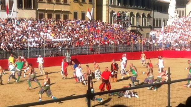 CAVALLERIA – E le premesse ci sono, considerato che anche l’anno scorso, giugno 2014, i Bianchi avevano superato gli Azzurri in semifinale, ma non riuscirono a conquistare palio e vitella perché la finale venne annullata per le polemiche scoppiate nell’altra semifinale, Verdi-Rossi, con i calcianti espulsi che non volevano uscire. Quest’anno, va detto subito, non ci sono stati problemi: gli espulsi non hanno fatto storie. Appena l’altoparlante ha pronunciato nome e stemma, si sono avviati al cancelletto d’uscita, sia pure a testa bassa e imprecando. Ma nessuno si è opposto. Positivo segno dei tempi. Così com’è assolutamente positivo che non ci siano stati, in nessuna delle tre partite, violenza gratuita, ripicche, inutili tentativi di vendetta. Nella sua foga, nei suoi scontri e nei suoi infiniti testa a testa, il Calcio storico 2015 sembra avviato a una nuova corretteza. Meglio: a un ritrovato senso della cavalleria. Ma prima di entrare in cronaca diretta, ecco alcune note: la squadriglia dei bombardieri, quella che spara il colpo di colubrina all’inizio e alla fine delle partite e segnala fragorosamente le cacce, ha vinto l’ambito trofeo intitolato alla memoria del colonnello “Aldighiero Batini”, uno dei fondatori del Calcio storico, negli anni ’30. Motivo? I bombardieri sono stati i migliori a sfilare nel corteo. Ovvio che non abbia potuto vincere il maestro di campo, Duccio Baglioni, anche oggi capace di fare il giro di Santa Croce, davanti al magnifico messere (lo stilista Stefano Ricci) con il cappello piumato in mano. Ma perché nessuno gli dice che va messo sulla testa? Ha paura di sciuparsi l’acconciatura impomatata? Impeccabile, invece, accanto al sindaco Dario Nardella, lord Provost Donald Wilson, suo omologo di Edimburgo, che, da autentico gentiluomo scozzese, è stato capace di esibire, in tribuna, uno straordinario gonnellino.