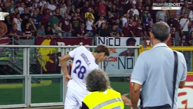 ARBITRO – Lo spagnolo esulta in maniera strana: va sotto la curva del Torino e fa il gesto del torero. Davanti ai tifosi del Toro. Provocazione. Perché? Paulo Sousa s’arrabbia e lo richiama, mentre l’arbitro Tagliavento lo ammonisce. Che cosa gli è preso a Alonso? Forse voleva scherzare, ma ha provocato un disastro. Da questo momento, ogni volta che tocca il pallone viene subissato di fischi. I viola insistono: Kalinic scatta in area, viene affrontato da due difensori e finisce a terra. E’ il 17’. Tagliavento indica il dischetto del rigore. Padelli e i difensori del Torino lo circondano. Protestano e chiedono l’intervento dell’arbitro di linea: che dà ragione ai granata. Viola basiti. Non basta: Tagliavento fa segno di espellere Ventura. No, gli chiede solo di togliersi la camicia bianca perché poteva confondersi con la maglia dei giocatori della Fiorentina. L’allenatore del Torino rientra con una maglia scura. Ma il problema è soprattutto il rigore prima concesso eppoi negato.