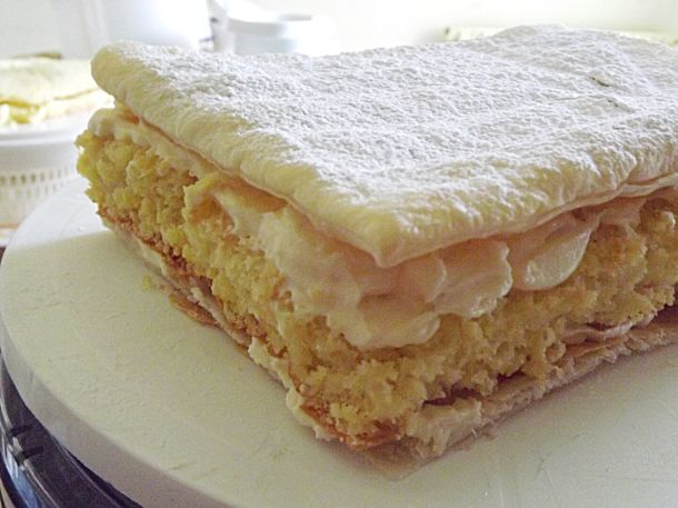- In a serving plate place one of the puff pastry discs and pour 1/4 of the diplomatico custard ; place one of the sponge cake on top, moist it with the liqueurs and spread another 1/4 of the cream; cover with the second sponge cake on top moist with the liqueurs and spread another 1/4 of the cream – cover with the second puff pastry disc.