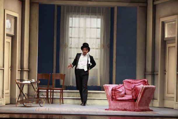Emilio Solfrizzi in «Sarto per signora» di Georges Feydeau; traduzione, adattamento teatrale e regia Valerio Binasco; con Viviana Altieri, Anita Bartolucci, Barbara Bedrina, Fabrizio Contri, Cristiano Dessì, Lisa Galantini, Simone Luglio, Elisabetta Mandalari; scene Carlo De Marino; costumi Sandra Cardini; luci Pasquale Mari; musiche Arturo Annecchino; regia Valerio Binasco