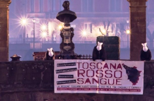 FIRENZE – Uno striscione sul Ponte Vecchio con il logo della campagna animalista «Toscana rosso sangue» è stato esposto domenica 24 gennaio da alcuni attivisti che si battono contro la proposta di legge regionale sulla caccia ai cinghiali per regolamentarne il numero in Toscana.