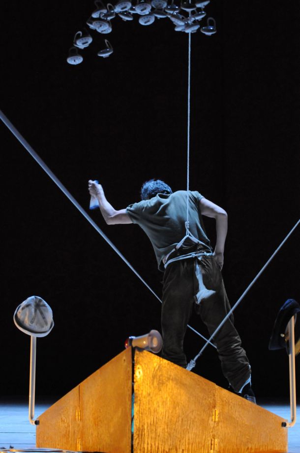 Compagnia Sud Costa Occidentale presenta «Acquasanta»; testo e regia di Emma Dante con Carmine Maringola; scene Emma Dante e Carmine Maringola; costumi Emma Dante; luci Marcello D’Agostino; una co-produzione: Compagnia Sud Costa Occidentale-Teatro Stabile di Napoli-CRT, Milano con il sostegno del Théâtre du Rond-Point, Paris