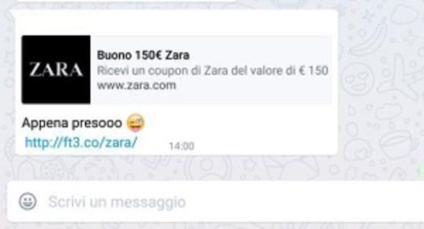 Le truffe su personal e telefonini si moltiplicano, coinvolgendo inconsapevoli gestori. Due anni fa erano le Gift card da ottenere grazie a Instagram, nel 2015 shopping card del valore di 500 euro su Facebook, adesso buoni acquisto da Zara dal valore di 150 euro in palio fra chi risponde a un semplice sondaggio, via WhatsApp da uno dei propri contatti. Il messaggio, che sembra personale, è accattivante ma nello stesso tempo credibile. Contiene il link per rispondere alle domande, che nulla ha naturalmente a che fare con il sito ufficiale di Zara, e un rassicurante invito dell’amico che è caduto nella trappola, con tanto di emoticon che strizza l’occhio e fa la linguaccia dicendo: “Appena preso”.