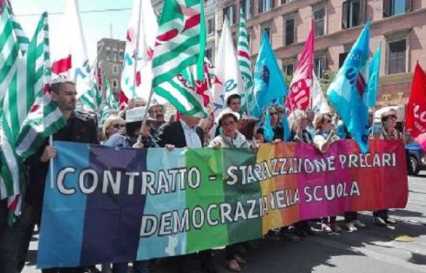 La scuola italiana oggi si è fermata scendendo in piazza per uno sciopero nazionale generale di docenti, dirigenti e personale ATA indetto dai sindacati Flc Cgil, Cisl Scuola, Uil Scuola e Snals Confsal. Le richieste dei sindacati al governo sono rinnovare il contratto, fermo da anni; rafforzare la contrattazione d’istituto; sburocratizzare la scuola; valorizzare le professionalità; stabilizzare i precari; adeguare le retribuzioni dei docenti alla media europea. “#ContrattoSubito è un diritto costituzionale, @Palazzo_Chigi e @matteorenzi fatevene una ragione”, ha scritto la Flc Cgil sul suo profilo Twitter.Sit-in, presidi sotto le Prefetture e cortei si sono svolti in diverse città italiane, da Roma a Torino, da Firenze a Bologna, da Napoli a Cagliari, ma anche a Messina, Livorno, Bari, Milano, Palermo, Pescara, Trieste e Campobasso.