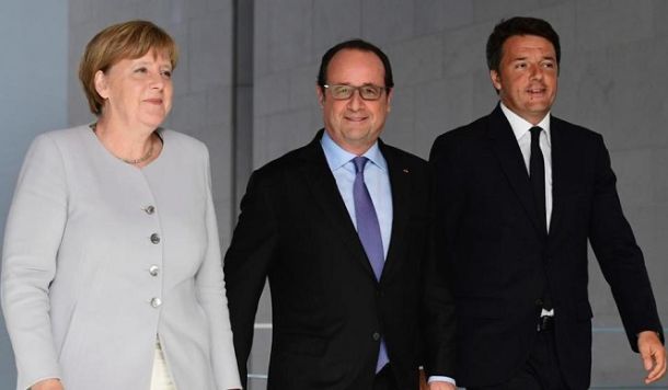 BERLINO – Angela Merkel, François Hollande e Matteo Renzi, riuniti a Berlino, si sono trovati d’accordo nel non aprire colloqui formali o informali con Londra sulla Brexit prima che la Gran Bretagna presenti formale richiesta di attivazione dell’articolo 50 del Trattato. Ha prevalso dunque la linea della cancelliera tedesca, che vede per il suo Paese una convenienza ad allungare i tempi della procedura e della decisione, mentre i due partners italiano e francese, dopo aver fatto dichiarazioni esplicite in senso esattamente contrario, si sono accodati alla tesi della Merkel. Visto che proprio oggi Cameron a Londra ha annunciato che non intende per ora attivare la procedura dell’art. 50 dei Trattati europei per l’uscita della Gran Bretagna, è evidente che i tempi saranno lunghi, forse oltre i due anni previsti. In barba ai propositi battaglieri di Renzi, che, prima dell’incontro di Berlino, ha più volte dichiarato che l’Europa non può permettersi un ulteriore anno di discussioni sulla Brexit.