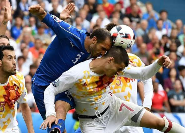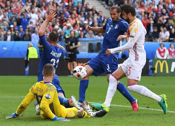 CHIELLINI – Lo stadio Saint Denis è invaso dalle maglie rosse dei tifosi spagnoli. Le maglie azzurre sugli spalti sono inferiori di numero ma si fanno sentire. Conte manda in campo la squadra più affidabile, quella che ha messo sotto il Belgio. Manca solo Candreva: al suo posto Florenzi. E la scelta sembra giusta. L’Italia prende le redini del gioco e fa soffrire la Spagna. Gli Azzurri di Conte, affamati di pressing e veloci nelle ripartenze, mettono alle corde le Furie Rosse apparse spaesate, irriconoscibili. De Gea si deve superare nei primi minuti per evitare un gol certo su colpo di testa di Pellè servito da Florenzi. Parolo imperversa. Al 14’ colpisce il palo. Gli spagnoli reclamano un fallo. Ma l’Italia è irrefrenabile e incontenibile. Al 33’ arriva il gol del vantaggio. Implacabile Chiellini che sfutta su tapin la ribattuta del portiere spagnolo dopo una potente punizione dal limite di Eder. Azzurri straripanti. Spagnoli che non si rassegnano e cominciano a picchiare. Sergio Ramos commette due fallacci da cartellino giallo. L’arbitro Cakir fa finta di nulla. Lo stesso Sergio Ramos va dall’arbitro per cercare di condizionarlo. E’ la sua specialità. De Rossi, Parolo e De Sciglio dominano a metà campo. Iniesta fa fatica a contrastare la manovra azzurra. Il prolungato possesso palla non funziona di fronte al dinamismo aggressivo dell’Italia.