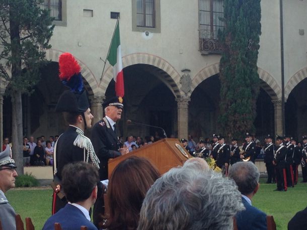 L’ammaina bandiera in forma solenne ha concluso l’ odierna cerimonia di saluto dei 330 marescialli allievi del 3° corso triennale 2013-2016 che si è svolta nel tardo pomeriggio all’interno del Chiostro Grande, alla presenza di Autorità, Invitati e dei familiari dei frequentatori del Corso. Il programma della cerimonia prevedeva anche la premiazione dei marescialli che hanno conseguito la laurea con lode e dei primi classificati al termine del terzo anno, nonché la consegna del gagliardetto del Corso al Comandante della Scuola Gen Div. Aldo Visone. Nel suo applaudito intervento il Comandante Generale Tullio Del Sette ha ,tra l’altro, partecipato ai convenuti la notizia delle odierne determinazioni del Governo sul transito del Corpo Forestale dello Stato nei Carabinieri.