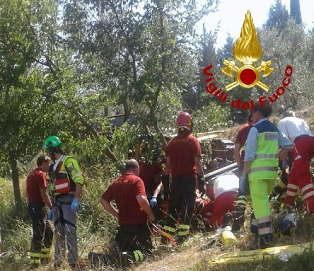2016-07-30-PHOTO-00001330RIGNANO SULL’ARNO – Continuano gli incidenti in agricoltura, in particolare dovuti a ribaltamenti di trattori, nelle campagne toscane. Vigili del fuoco e personale sanitario del 118 sono intervenuti a Rignano sull’Arno (Firenze) per soccorrere un uomo travolto dal trattore in un terreno, in pendio, nei pressi di via Santa Maria. L’agricoltore, che ha riportato gravi traumi nell”incidente, è stato prima estratto da sotto il mezzo dai vigili del fuoco e curato sul posto dai sanitari, poi è stato trasportato all’ospedale di Careggi in codice d’urgenza ”rosso”