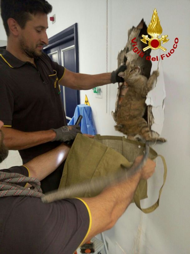 2016-08-10-PHOTO-00001476FIRENZE – Un gattino è caduto stasera nella canna fumaria, ormai inutilizzata, di un edificio di piazza della Stazione a Firenze. Il gatto è stato recuperato dai vigili del fuoco che, dopo averlo individuato con una termocamera, hanno demolito una parte della muratura per salvarlo.