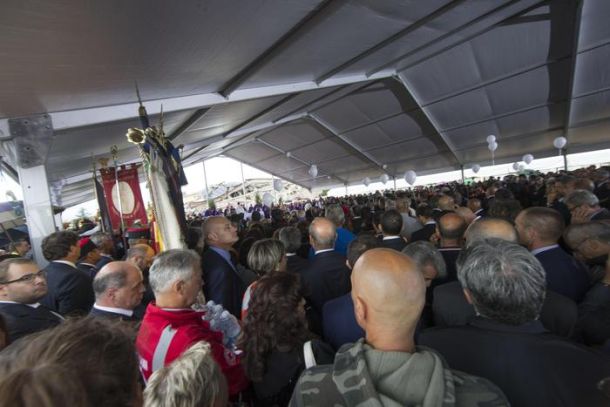 I volontari della Protezione Civile hanno predisposto, sotto una pioggia battente, due grosse tensostrutture nel cortile del complesso Don Minozzi, la struttura educativa per buona parte crollata con la scossa del 24 agosto. A celebrare le esequie funebri è il vescovo di Rieti Domenico Pompili, l’ex vescovo dell’Aquila Molinari e il vescovo di Ascoli Giovanni D’Ercole. Presenti anche il premier, Matteo Renzi, e il presidente della Repubblica, Sergio Mattarella, oltre ai presidenti della due Camere, Grasso e Boldrini.