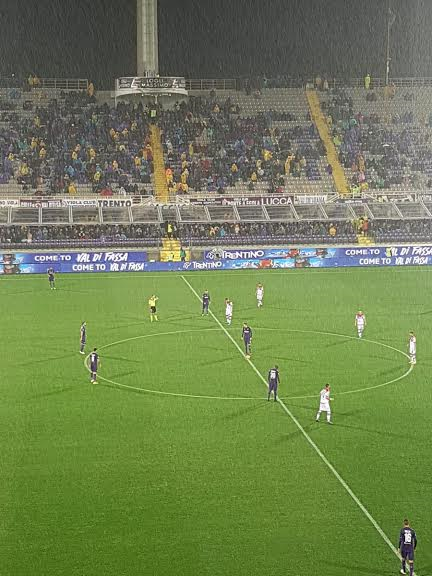 TEMPORALONE – Ha aspettato le 20,30, il cielo, per aprire le cateratte e rovesciare un acquazzone tropicale sullo stadio Franchi. E’ un’acqua fitta, violenta, incessante, che non dà tregua e penetra nelle ossa. Eroi i tifosi sottoposti allo scroscio in uno stadio inesorabilmente anni Trenta, quindi scoperto per tre quarti. Meritevoli di menzione anche gli ottanta-cento arrivati da Crotone. Paulo Sousa fa turn over: in panchina Borja Valero, Kalinic, Milic e anche Tomovic, ma in questo caso si tratta di scelta, visto che Salcedo offre garanzie. Là davanti Babacar è unica punta, ma Bernardeschi ha una posizione molto avanzata, sulla sinistra del centravanti. Anche Tello punta a rete. Il problema? La pioggia fitta e il terreno inzuppato. Calciare il pallone significa sollevare nuvole d’acqua. Il Crotone cerca di sorprendere i viola puntando proprio sulle condizioni climatiche. Falcinelli e Stoian (ex Roma) si fanno vedere in avvio. Ma il primo tiro in porta vero è di Ilicic (9’) da poco fuori area. Cordaz respinge tuffandosi sulla sua sinistra. Altra respinta del portiere (11’) su conclusione di Vecino. Quindi è Tello (12’) a mettere scompiglio nella difesa calabrese con tiro finale e parata in due tempi di Cordaz.