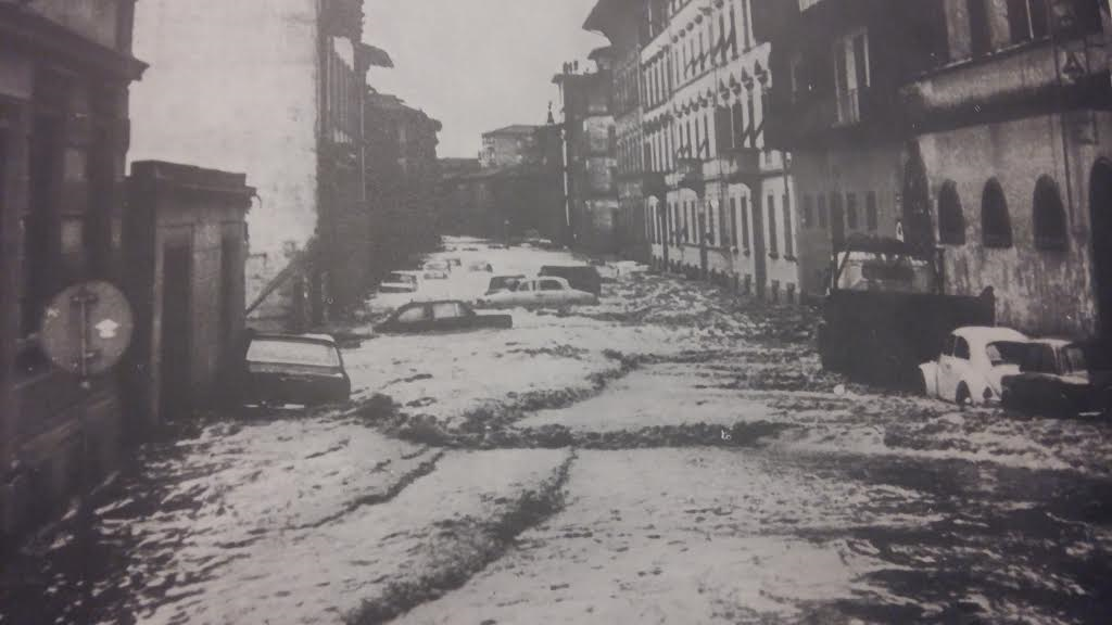 EROE – La quantità d’acqua è eccezionale: un idrometro a monte di Firenze ne segnalava sei metri e novanta, appena quarantacinque centimetri sotto il massimo delle piene degli ultimi anni. L’Arno saliva, saliva. Faceva paura! All’Anconella gli impianti dell’acquedotto erano ricoperti dall’acqua. E che alle una avevano staccato i motori. Dalla cronaca di Firenze de La Nazione avevano esortato l’operaio di turno, Carlo Maggiorelli, che aveva risposto alla loro chiamata, a scappar via. Ma lui non poteva lasciare gli impianti senza sorveglianza. Un eroe. Non molto più tardi venne stampato il sommario ossia la locandina de La Nazione del 4 novembre 1966: «L’Arno straripa a Firenze”. Poi la situazione precipitò. Mentre in tutt’Italia si celebrava il 4 novembre, festa delle forze armate e la vittoria nella guerra 1915-18 contro l’Austria-Ungheria, la valanga d’acqua rotolava senza freni su Firenze. L’Arno aveva rotto a Bellariva: pareva un’ironia macabra quel nome, pronunciato nella tempesta. Dalle cinque alle sei, c’erano state consultazioni febbrili fra il prefetto e i comandi militari. L’acqua aveva debordato e allagava le strade vicine al fiume. Le fogne saltavano. Via dell’Agnolo era già un torrente. Via de’ Bardi era investita da un’onda diretta e dal rigurgito del Pote Vecchio. La pavimentazione stradale scoppiava nel lungarno Ferrucci, nel lungarno Serristori, nel lungarno delle Grazie. A La Nazione, il nuovo stabilimento era stato inaugurato solo quattro settimane prima. Ora giornalisti e tipografi avevano il fango alla cintola. Le rotative, nuove di zecca, non tutte già adoperate, erano sepolte da qualche metro di una poltiglia fatta di acqua, fango e nafta. Qualche operaio era accorso e piangeva.