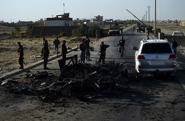 Afghan security personnel keep watch near the largest US military base in Bagram, 50 km north of Kabul, after an explosion on November 12, 2016. Four people were killed November 12 in an explosion inside the largest US military base in Afghanistan, NATO said, with local officials blaming a suicide attacker posing as a labourer for the major security breach. / AFP PHOTO / SHAH MARAI