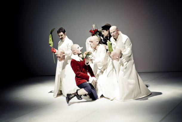 Fortebraccio Teatro presenta «Ubu roi» di Alfred Jarry, adattamento e regia Roberto Latini, con Roberto Latini e con Savino Paparella, Ciro Masella, Sebastian Barbalan, Marco Jackson Vergani, Francesco Pennacchia, Guido Feruglio, Fabiana Gabanini; musiche e suoni Gianluca Misiti; scena Luca Baldini, costumi Marion D’Amburgo; luci Max Mugnai; un progetto realizzato con la collaborazione Teatro Metastasio Stabile della Toscana
