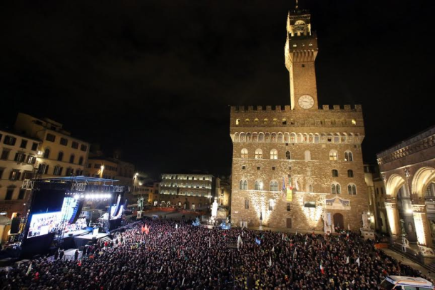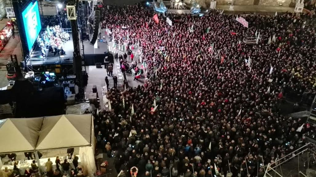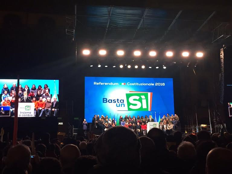 Forse per scaramanzia, Renzi ha voluto chiudere la campagna referendaria proprio nella stessa piazza che lo aveva accolto nel 2014, per le europee, che segnarono un trionfo per il Pd. Oggi in quella piazza simbolo sono arrivate migliaia di persone e militanti con tante bandiere dei comitati per il Sì: caldarroste, panini, vin brulé, tè e caffé distribuiti per sopportare meglio le temperature invernali, anche se la serata è stata abbastanza clemente. «Con i no l”Italia non va da nessuna parte con il si comincia il futuro», scandisce Renzi che cita