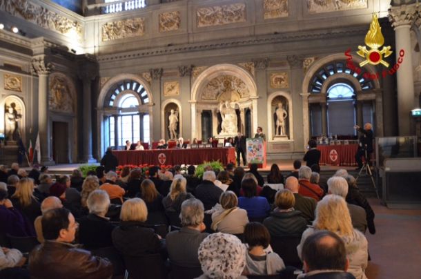 FIRENZE – Si è svolta a Firenze, in Palazzo Vecchio, la cerimonia di premiazione di Firenze Capitale d’Europa premio letterario internazionale Acsi, giunto alla ventunesima edizione. In apertura dell’evento è stato consegnato uno speciale riconoscimento al Corpo Nazionale Vigili del Fuoco, per l’encomiabile opera svolta durante l’alluvione di Firenze del novembre 1966. A ritirare gli attestati il direttore regionale Vigili del Fuoco Gregorio Agresta che ha ricordato l’impegno nel giorni dell”alluvione di 50 anni fa e come, in particolare, i vigili del fuoco salvarono inestimabili manoscritti e opere d’arte strappate dal fango, tesori unici al mondo poi restaurati e restituiti all’umanità. Premiati anche gli ingegneri Di Censo e Sparnacci dell’Associazione Nazionale Vigili del Fuoco, in rappresentanza dei Vigili in congedo, quelli che 50 anni fa salvarono dal fango oggetti dal valore inestimabile.