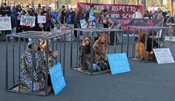 FIRENZE – Singolare protesta del movimento animalista a Firenze contro la sofferenza degli animali uccisi ogni anno per la loro pelliccia. Rinchiusi in tre grandi gabbie in piazza della Repubblica a Firenze per un’azione dimostrativa sulla crudeltà e vanità umane.