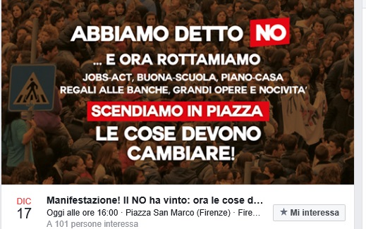 Secondo Lorenzo Bargellini, leader del Movimento Lotta per la Casa di Firenze, che ha fatto riferimento ad alcuni recenti sgomberi e sfratti in città, «non ci sembra che il messaggio di protesta sociale forte, proveniente dalla vittoria del No, sia stato recepito da parte delle istituzioni, che continuano a favorire profitti e interessi».