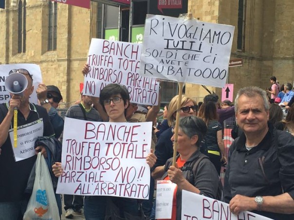 AREZZO – Nuova protesta in città del Comitato vittime del salvabanche, che chiedono l’applicazione, anche per loro, del salvagente applicato ai colleghi del Monte dei Paschi attraverso l’ultimo decreto del Governo. La notizia è stata riportata solo da alcuni quotidiani locali. Stamani in Corso Italia, al grido di «Ladri, ladri, ladri», una cinquantina di risparmiatori ha inteso ricordare la propria condizione di difficoltà. Tutte persone che dal 22 novembre 2015 stanno portando avanti la propria battaglia cercando di recuperare i denari persi con l’applicazione del decreto che ha consentito il salvataggio di Banca Etruria, Banca Marche, CariChieti e Carife.
