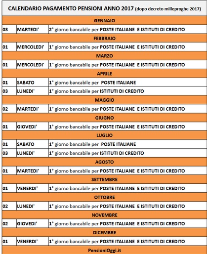 Le notizie sono quelle riportate dal sito specializzato pensioniOggi.it, che ha pubblicato il nuovo calendario delle date di pagamento delle pensioni per il 2017 sulla base della modifica contenuta nel decreto legge milleproroghe. Eccolo riprodotto qui di seguito per la comodità dei nostri lettori.