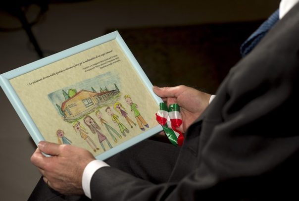 Cari concittadini, qualche giorno fa, nelle zone del terremoto, ho ricevuto questo disegno in dono dai bambini della scuola dell’Infanzia di Acquasanta Terme, ritrae la loro scuola. Vi è scritto: “La solidarietà diventa realtà quando si uniscono le forze per la realizzazione di un sogno comune”. Vorrei concludere facendo mio questo augurio, e rivolgendolo a ciascuno di voi, perché i sogni dei bambini possono costruire il futuro della nostra Italia.