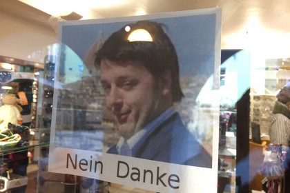 ORTISEI – Nein Danke, in italiano No grazie. E’ la frase che compare sotto una foto di Matteo Renzi affissa sulla vetrina di un negozio di ottica del centro di Ortisei, in Val Gardena, meta delle vacanze natalizie dell’ex presidente del Consiglio. Il proprietario dell’ottica, che si trova proprio a due passi dall’hotel scelto da Renzi per soggiornare in queste vacanze, non ha voluto rilasciare alcuna dichiarazione, neanche per dire se per caso il segretario del Pd fosse entrato o meno nel suo negozio per fare acquisti.