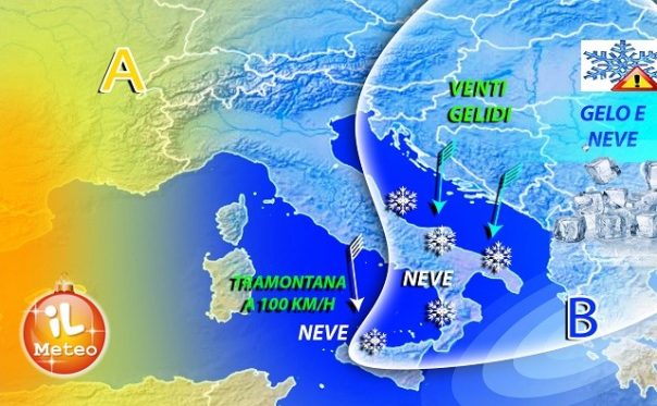 Secondo il Centro Epson Meteo, il picco di freddo è atteso per la giornata di sabato. Domenica, invece la morsa del gelo andrà attenuandosi lentamente. I primi fiocchi di neve al sud sono attesi nella serata e nella notte di domani, a livello del mare, sulle coste adriatiche e in Sicilia, dopo una giornata di rovesci e venti forti. Secondo 3BMeteo, le principali città che vedranno la neve saranno: Ancona, Pescara, Teramo, Chieti, Macerata, Termoli, Campobasso, L’Aquila, Foggia, Bari, Lecce, Matera, Potenza, Benevento, Avellino, Crotone, Cosenza, Catanzaro. E qualche fiocco è possibile anche a: Napoli, Caserta, Lamezia Terme, Reggio Calabria, Palermo, Messina, Trapani, Catania. Sui rilievi etnei, Madonie, Nebrodi e Sila sono previsti oltre 40/50cm di neve, a partire dalle quote medie.