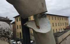 AREZZO – Sono state probabilmente le temperature rigide, scese ad Arezzo a meno sei, a provocare la contrazione della lancia metallica che è connessa alla mano della statua ottocentesca che ritrae Ferdinando III di Toscana nel centro storico di Arezzo, in piaggia del Murello, provocando il distacco del polso. Conseguentemente è caduta a terra una porzione di circa 10 centimetri per 5 di marmo: nessun danno a passanti o auto. La lesione è stata scoperta stamani. La statua è stata messa in sicurezza dai vigili del fuoco intervenuti sul posto insieme alla polizia municipale e al sindaco Alessandro Ghinelli salito personalmente sulla scala per verificare i danni. Il polso della statua, già riparato nello stesso punto qualche anno fa, è stato fasciato per evitare altri distacchi e sarà sistemato definitivamente dalla Soprintendenza.
