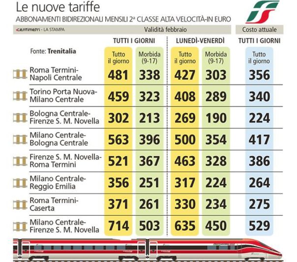 ROMA – Quattro versioni, diverse per prezzo e ampiezza d’uso. Ma sostanzialmente un rincaro medio per le principali tratte del 35%. I clienti delle Frecce AV potranno ancora contare, da febbraio, su un abbonamento mensile che l’azienda venderà, senza alcun corrispettivo pubblico, ad un valore equivalente a quello di 8, o al massimo 14, biglietti di corsa semplice, all’attuale prezzo base.