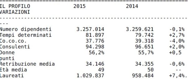 ROMA – Donna, over50, diplomata ma forse anche laureata. Ecco l’identikit del dipendente pubblico, come viene fuori dal conto annuale della Ragioneria generale dello Stato, che ha aggiornato i quadro al 2015. Salgono età media, ormai oltre la soglia dei 50 anni, la fetta in rosa, le donne sono la maggioranza, e anche la percentuale di chi ha il titolo accademico, nel tentativo di recuperare un noto ritardo. Di seguito la tabella con il profilo del travet.