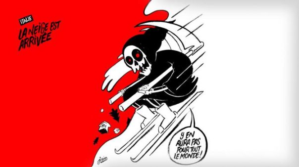 AMATRICE – «La neve è arrivata, ma non per tutti». Charlie Hebdo non si smentisce e dopo le vignette sul terremoto di Amatrice è tornata a ironizzare sulle tragedie italiane. L’ultima vignetta choc ha rappresentato la morte sugli sci che scende facendo saltare case e alberi, con riferimento chiaro alla tragedia di Rigopiano, proprio mentre tutti i soccorritori erano impegnati nella ricerca dei superstiti.
