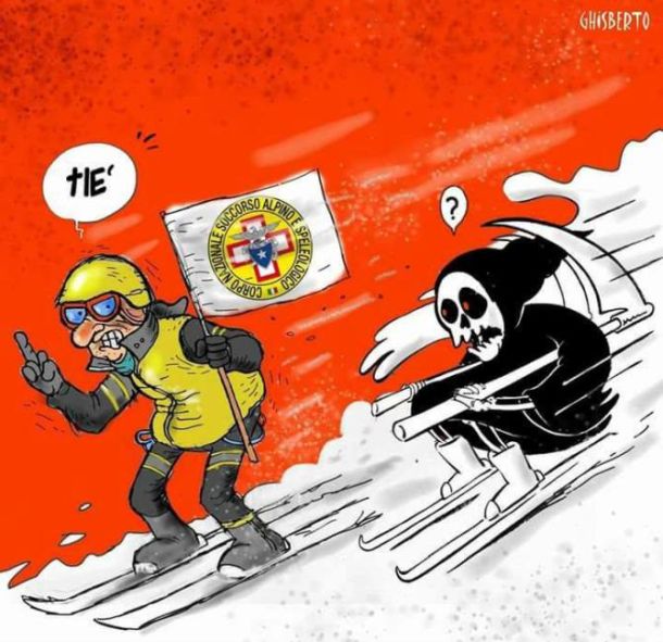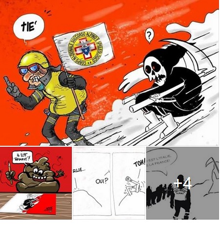 REAZIONI – Unanime l’esecrazione, ricordando anche analoga vignetta gravemente offensiva, pubblicata dal giornale satirico francese in occasione del terremoto di Amatrice. Mentre il sindaco di Farindola, Ilario Lacchetta, annuncia querela nei confronti della rivista e degli autori della vignetta choc, il primo cittadino di Amatrice Sergio Pirozzi decide di dare una lezione di satira al periodico francese. Pirozzi, vittima di un vignetta altrettanto offensiva dopo il terremoto del 24 agosto scorso che ha spazzato via la città, posta sulla sua pagina Facebook una serie di disegni di replica. Ecco allora lo sciatore del Soccorso alpino che supera in discesa la morte disegnata da Charlie Hebdo e mostra l’indice dicendo Tiè. Un’altra vignetta ritrae la morte che se ne va dalla scena della tragedia all’hotel Rigopiano e un volontario che spiega, in francese: «Questa è l’Italia, non la Francia». Poi un braccio che emerge dalla neve con il cartello: «Non molliamo un c…», un altro che fa il gesto dell’ombrello ai francesi, un altro ancora con una mano con il dito medio alzato che regge il tricolore…