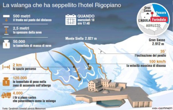 SLAVINA – Come 4.000 tir a pieno carico: questa la pressione esercitata dal fronte di distacco della slavina che si è abbattuta sull’hotel Rigopiano, che nella zona di accumulo pesa 120.000 tonnellate. Sono i dati dei Carabinieri forestali del servizio Meteomont.