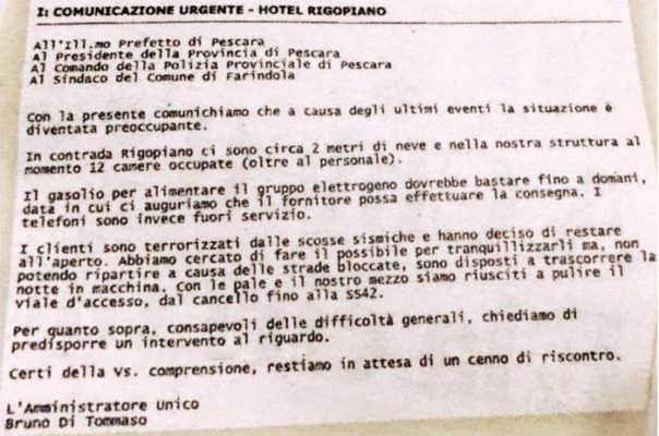 EMAIL HOTEL – Intanto si viene a conoscenza che il 18 gennaio scorso, dopo il succedersi di scosse sismiche e di intense nevicate, l’amministratore unico dell’hotel Rigopiano, Bruno Di Tommaso, aveva mandato una mail al Prefetto di Pescara, al presidente della Provincia, alla polizia provinciale e al sindaco di Farindola, segnalando che la situazione stava diventando preoccupante e chiedeva di predisporre un intervento. I clienti sono terrorizzati dalle scosse sismiche e hanno deciso di restare all’aperto, scriveva il direttore, non potendo ripartire a causa delle strade bloccate.