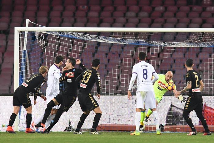 TATARUSANU – Vicinissima al gol, la Fiorentina (21’) con Astori . Grande parata di Reina. Astori ha colpito con il naso. Sanguinante. Rovesciamento di fronte: Pavoletti, da ottima posizione, calcia altissimo. Fallo di Sanchez su Insigne. Sanchez ammonito. Punizione diretta di Insigne e Tatarusanu compie una gran deviazione. Preme il Napoli. Ancora Tata, stavolta di pugno, su punizione di Callejon. Il doppio handicap dei viola, ossia le assenze di Gonzalo e Borja, pesa sulla partita dei viola. Che devono soprattutto contenere. E fanno fatica. Sporadiche le ripartenze, proprio perchè deve sopperire ad assenze fondamentali. Soffre Carlos Sanchez, contro i guizzi i Insigne che però non è preciso nelle conclusioni. In ogni caso, il primo tempo finisce senza reti. Primo tempo faticoso per i viola, ma era prevedibile. L’obiettivo? Nella ripresa va servito meglio Kalinic. E Bernardeschi dovrebbe ritrovare l’estro della partita giocata a Fiorenze contro il Napoli, in campionato.