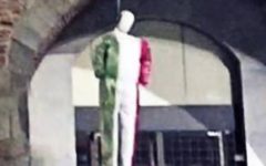 PRATO – Un manichino tricolore impiccato ad una corda è stato appeso la notte scorsa al terrazzo di Palazzo Pretorio, sede del museo civico di Prato in piazza del Comune.