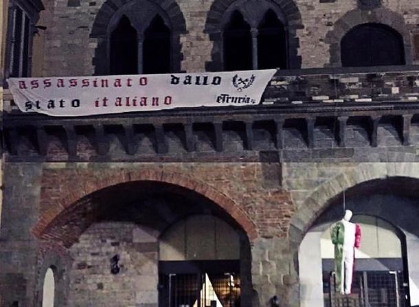 Il gesto è stato rivendicato dai giovani del circolo di estrema destra ‘Etruria 14’. Sotto il fantoccio è stato appeso uno striscione con la scritta Assassinato dallo Stato italiano. Dura la condanna delle istituzioni pratesi: Manifestazioni come quella codarda di questa notte a firma di Etruria 14 non fanno parte della cultura della nostra realtà. Se pur da posizioni diverse – ha detto il sindaco di Prato Matteo Biffoni – sono certo che tutte le forze politiche presenti in Consiglio comunale condividano la condanna di quanto è accaduto. Nei giorni in cui gli studenti delle nostre scuole sono in viaggio con il Treno della memoria, ribadiamo con forza che Prato è una città che vive e lavora nel solco dei valori costituzionali. Chi scommette il proprio futuro qui e rispetta le regole è nostro cittadino.