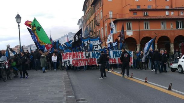 PISA – Oltre 300 tifosi pisani hanno partecipato stamani pacificamente alla manifestazione di protesta promossa dai gruppi organizzati contro le diffide collettive in arrivo in questi giorni per i disordini di Empoli del 17 settembre scorso prima di Pisa-Brescia. La questura di Firenze ha infatti emesso 87 daspo a carico dei supporter nerazzurri, una misura considerata spropositata da gran parte della tifoseria pisana. Dopo il raduno in piazza Garibaldi il corteo ha raggiunto la prefettura per un presidio di qualche minuto per poi proseguire verso il Comune. Infine, i manifestanti sono tornati in piazza Garibaldi dove hanno ascoltato in diretta, attraverso la radio, la partita del Pisa impegnato in trasferta a Novara. Per partecipare alla protesta molti tifosi hanno infatti rinunciato a seguire la squadra nonostante avessero già acquistato il biglietto e nel settore ospiti dello stadio piemontese sono presenti solo poche decine di sostenitori giunti dalla Toscana.