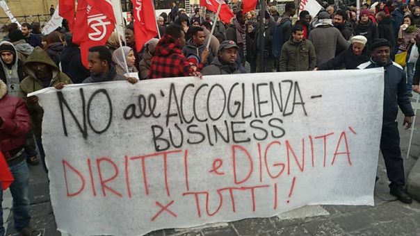 Il corteo si apre con uno striscione su cui è scritto «no all’accoglienza business diritti e dignità per tutti». I manifestanti chiedono diritti e dignità per tutti a partire dal gruppo di rifugiati politici che abitavano all’ex-Aiazzone e da due settimane hanno occupato lo stabile di via Spaventa. Dopo una breve permanenza in un palazzetto dello sport, alla comunità di somali, etiopi ed eritrei che si trovavano nell’ex mobilificio è stato proposto di essere ospitati in piccoli gruppi, ma da parte loro è venuto un rifiuto con la richiesta di rimanere tutti insieme, circa una ottantina di persone. «Nessuno è venuto a trattare con la comunità di migranti – ha spiegato uno degli organizzatori – e le uniche proposte che sono state avanzate sono offensive e inaccettabili». Slogan anche contro il prefetto di Firenze (prefetto vergogna) che ha recentemente affermato di voler intervenire contro le occupazioni abusive.