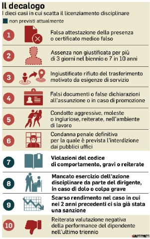 Nel decreto, previsto per metà febbraio, dovrebbe anche essere stabilito che in caso di procedura ordinaria entro tre mesi, non più quattro, l’azione deve essere conclusa. Resta fermo il licenziamento sprint, di 30 giorni, per il furbetto del cartellino, che dovrebbe essere esteso a tutte le forme illecite che portano a licenziamento accertate in flagranza.