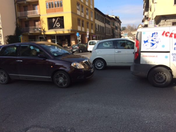 Lo testimoniano le nostre foto, ore 12,45 di sabato 11 febbraio, quindi non un’ora di uscita degli studenti dal Liceo Pascoli, quando abitualmente si crea intasamento di pedoni e di auto dei genitori che aspettano a scuola ragazzi e ragazze da 1,70 – 1,90 per 70 kg e più. Traffico, code, suoni di clackson, improperi, senza che appaia all’orizzonte l’ombra di un vigile urbano. Ma non era stato rafforzato il servizio su strada?