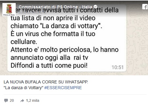 «Anche voi avete ricevuto su whatsapp questo messaggio? “Per favore avvisa tutti i contatti della tua lista di non aprire il video chiamato La danza di vottary. È un virus che formatta il tuo cellulare. Attento e’ molto pericolosa, lo hanno annunciato oggi alla rai tv. Diffondi a tutti come puoi!»